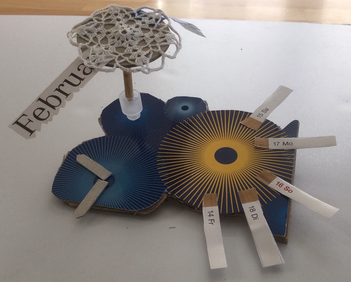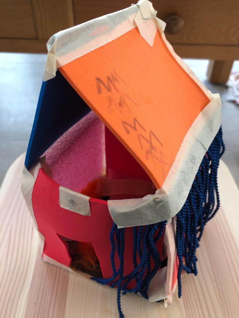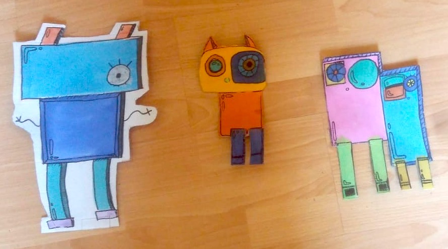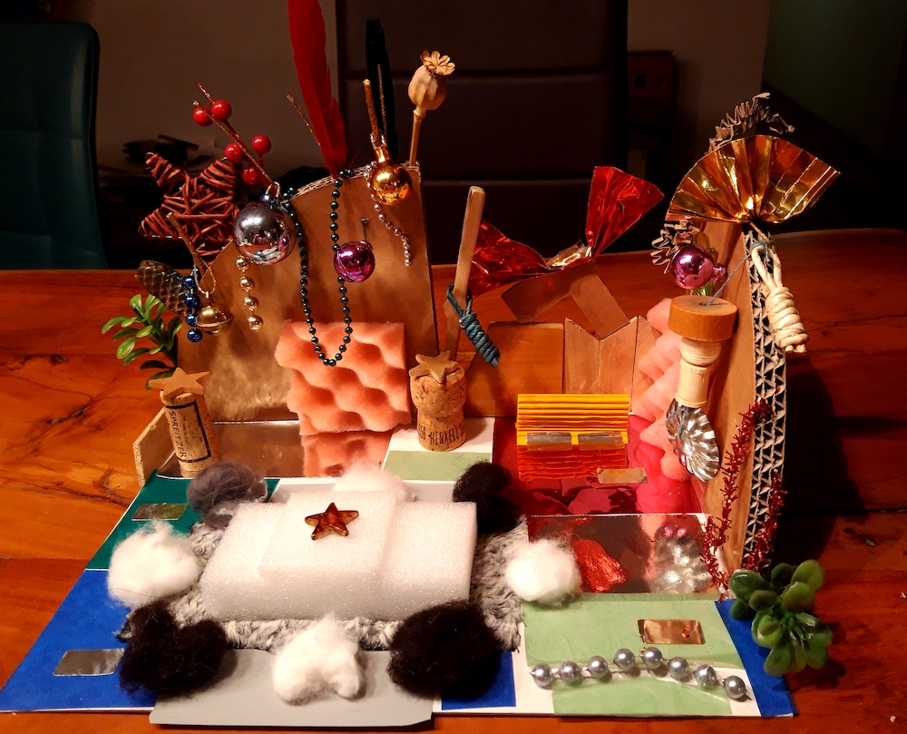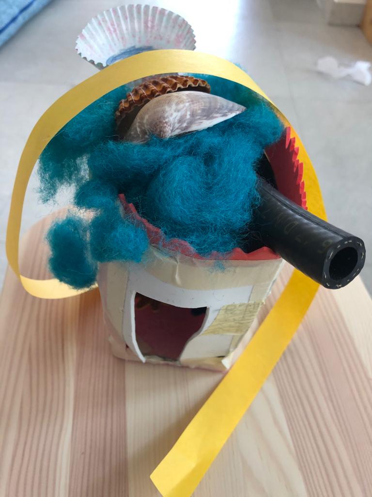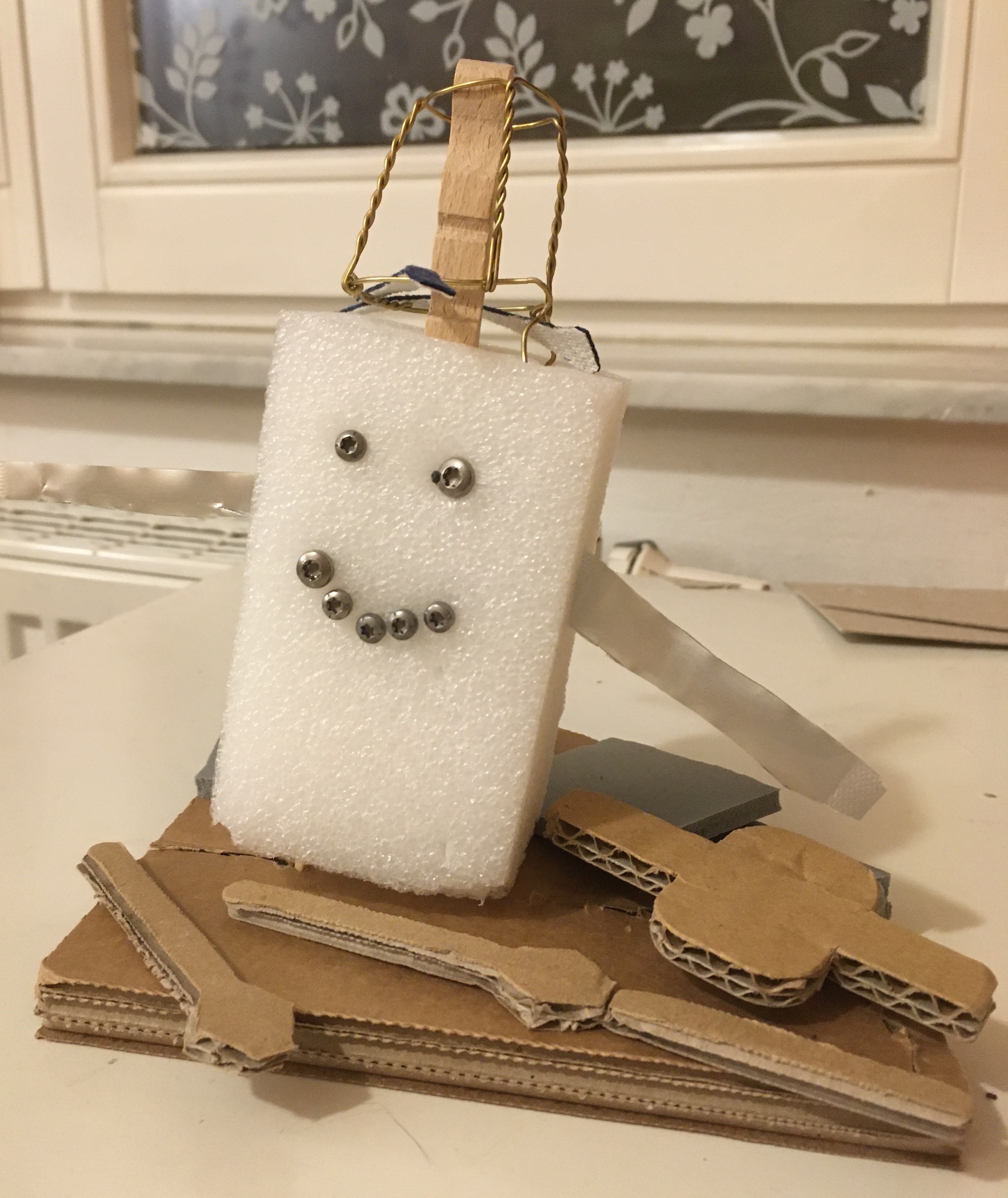 „Ein Roboter, den wir - ohne Kleber - aus dem Materialfreude-Koffer erstellten. Er hat eine Krone mit Antenne, Haare, einen Säbel und Schwerter. Wenn man die Schrauben versetzt, kann er auch grimmig gucken!“