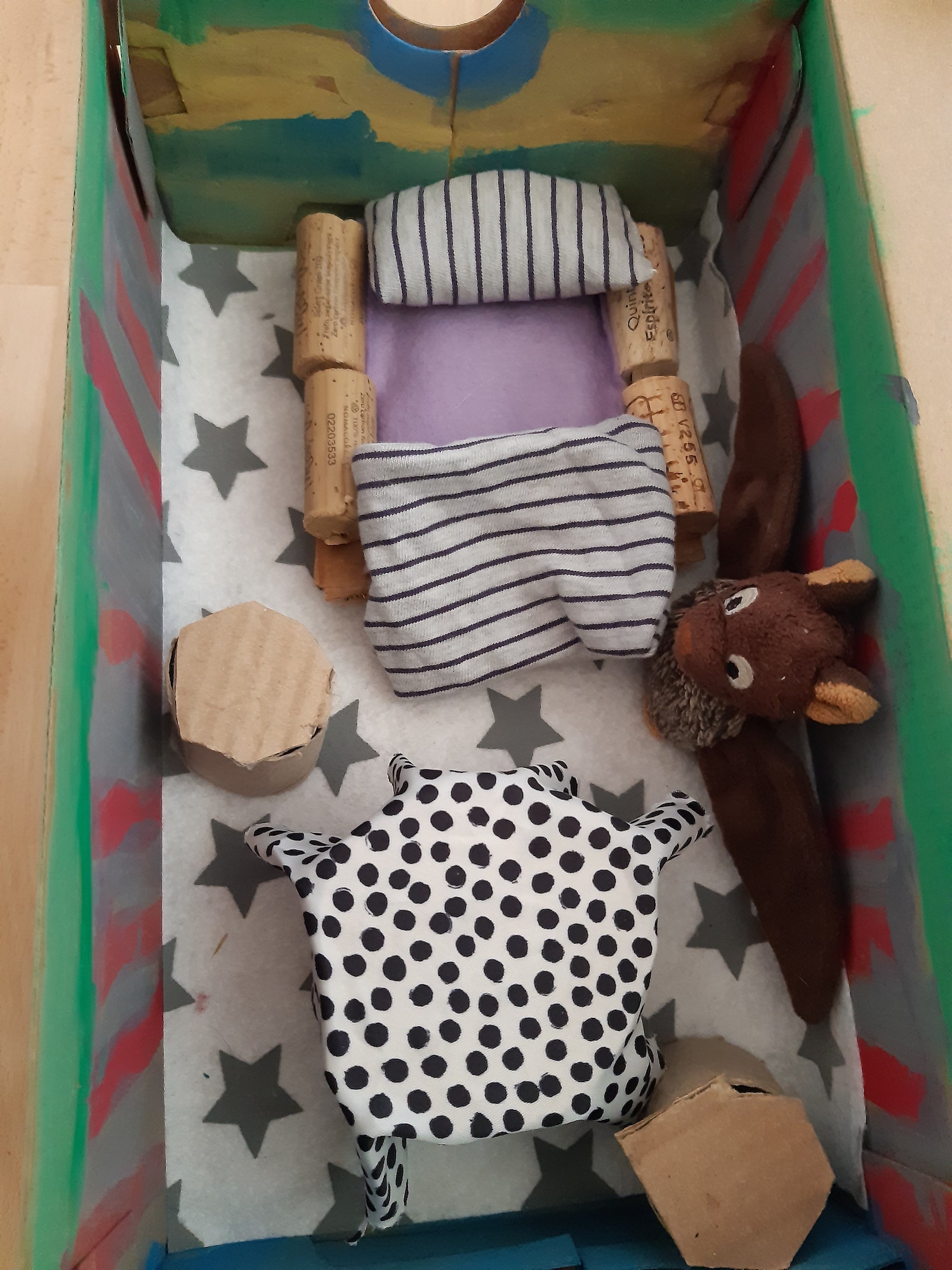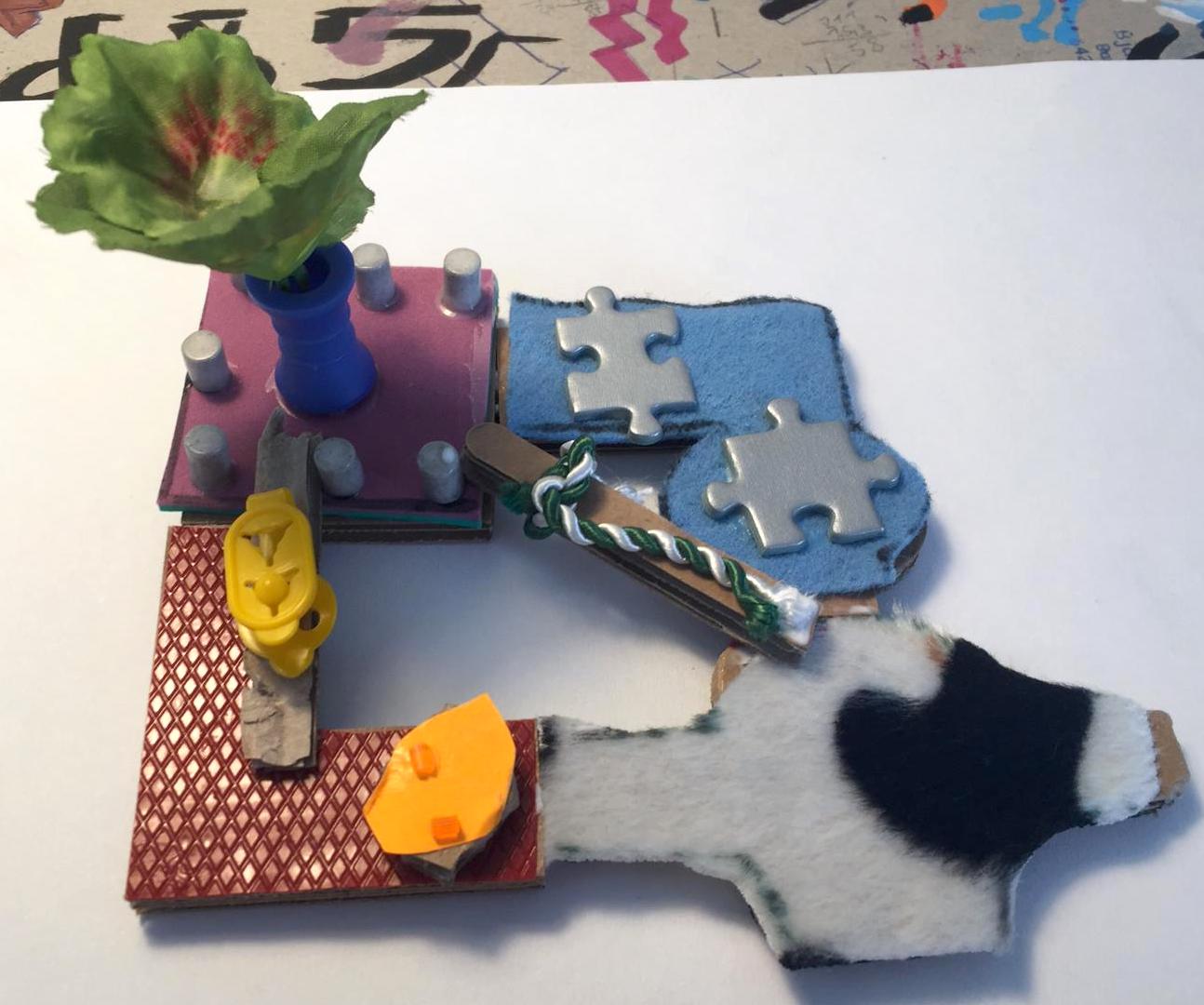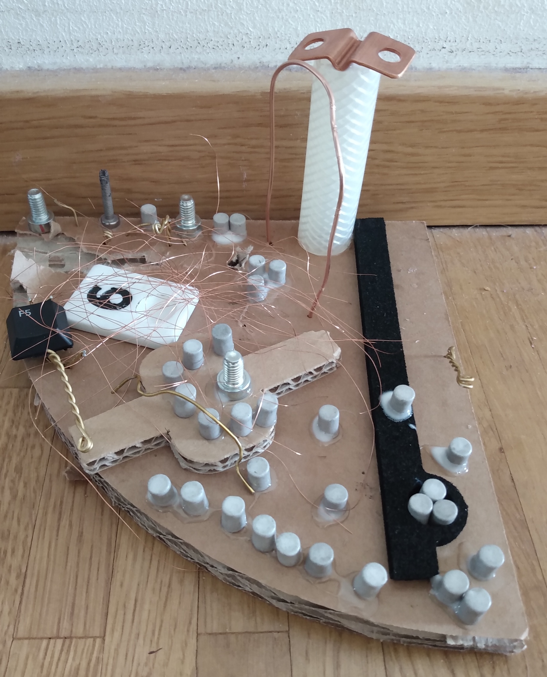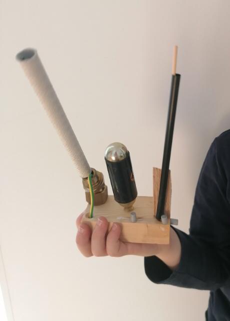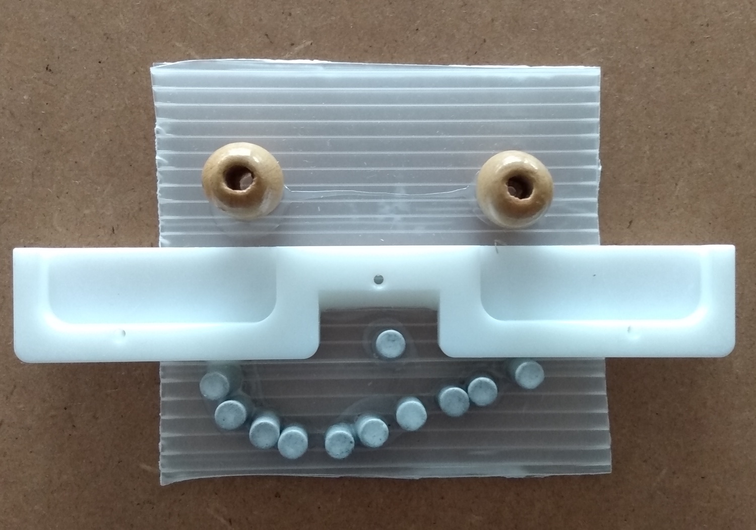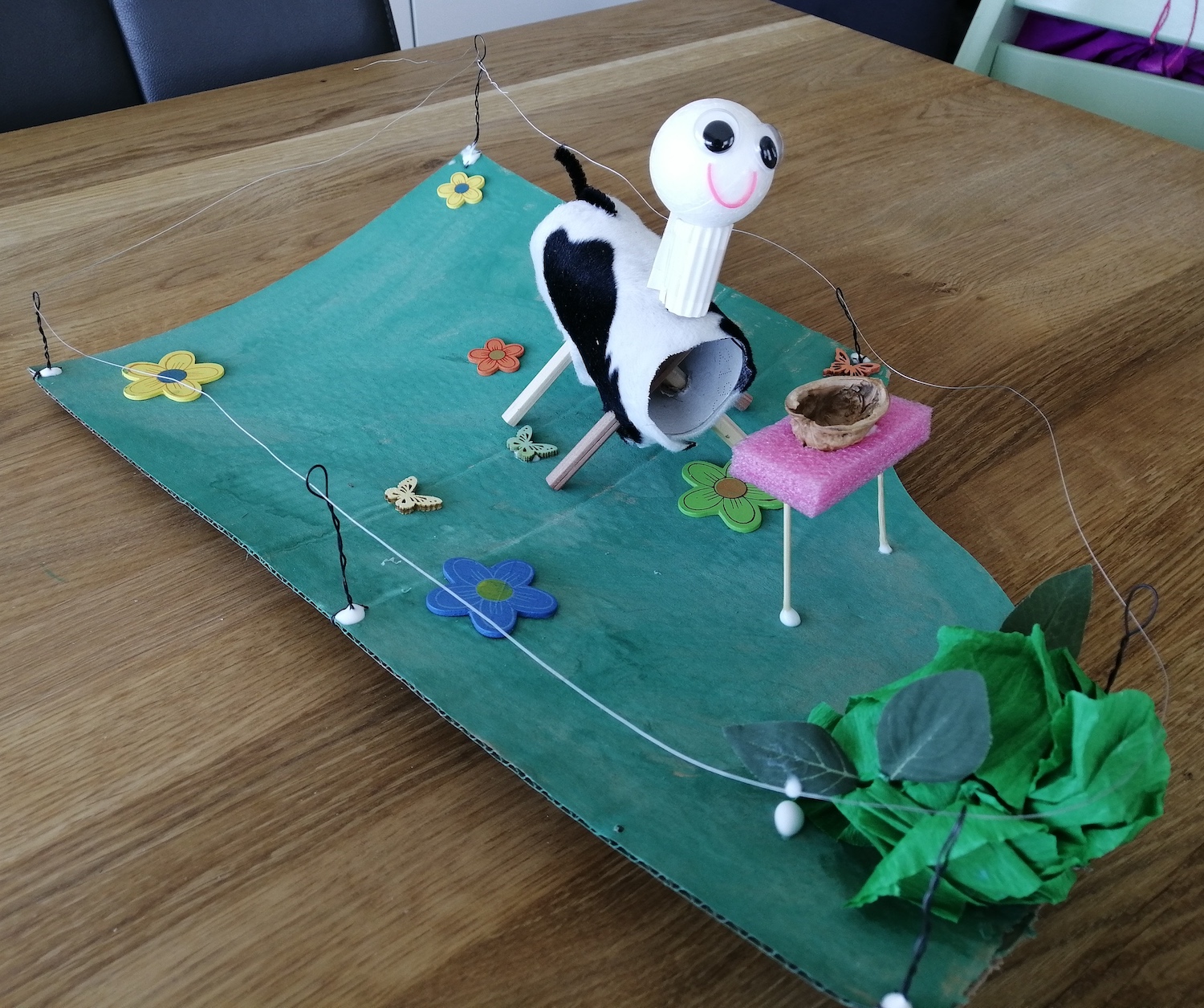„Ein Roboter, den wir - ohne Kleber - aus dem Materialfreude-Koffer erstellten. Er hat eine Krone mit Antenne, Haare, einen Säbel und Schwerter. Wenn man die Schrauben versetzt, kann er auch grimmig gucken!“