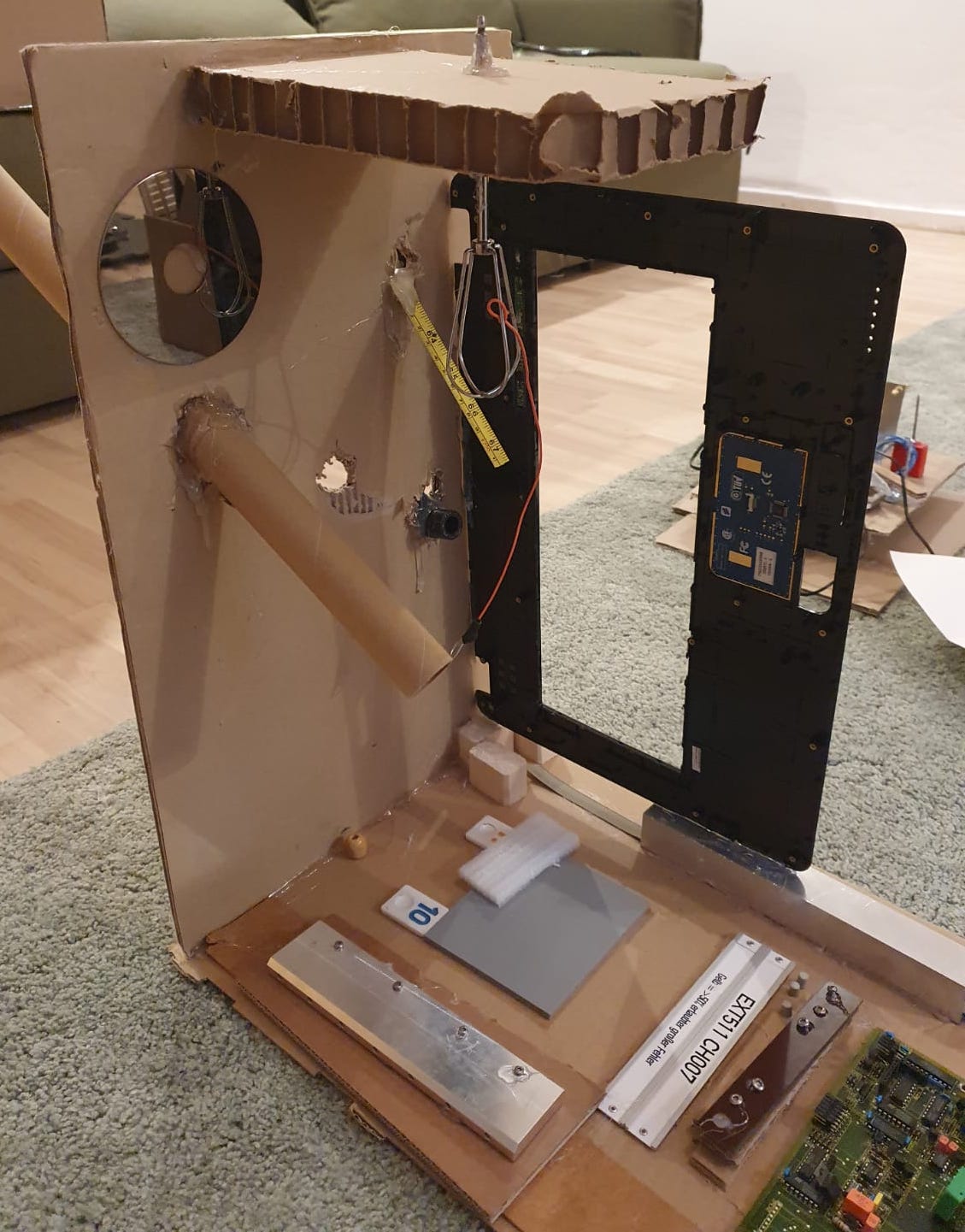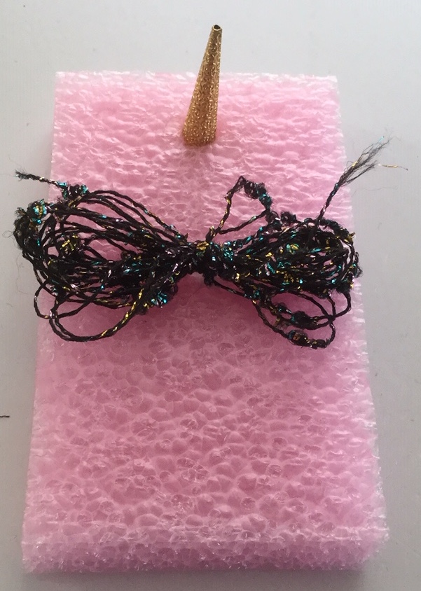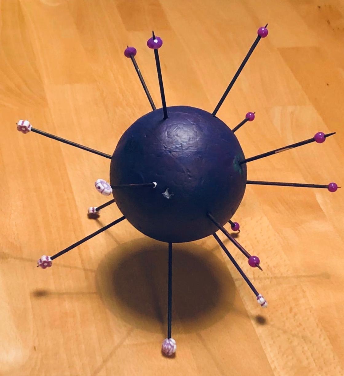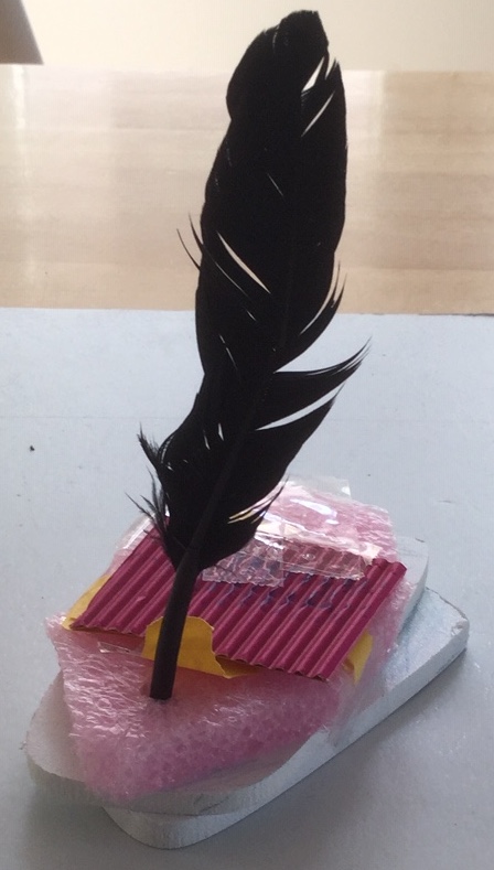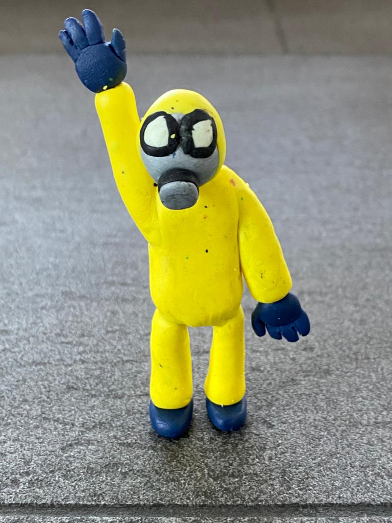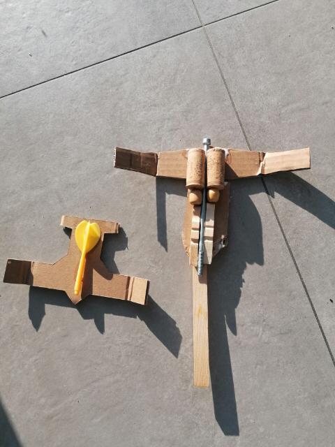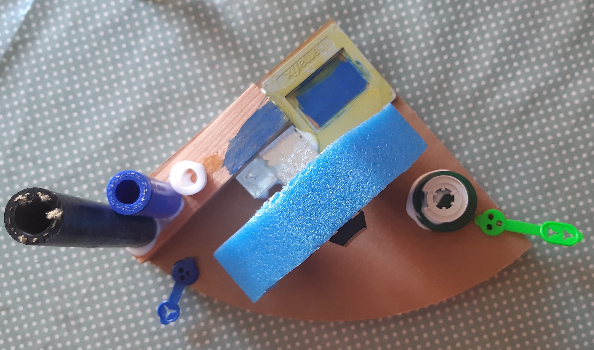 „Ein Roboter, den wir - ohne Kleber - aus dem Materialfreude-Koffer erstellten. Er hat eine Krone mit Antenne, Haare, einen Säbel und Schwerter. Wenn man die Schrauben versetzt, kann er auch grimmig gucken!“
